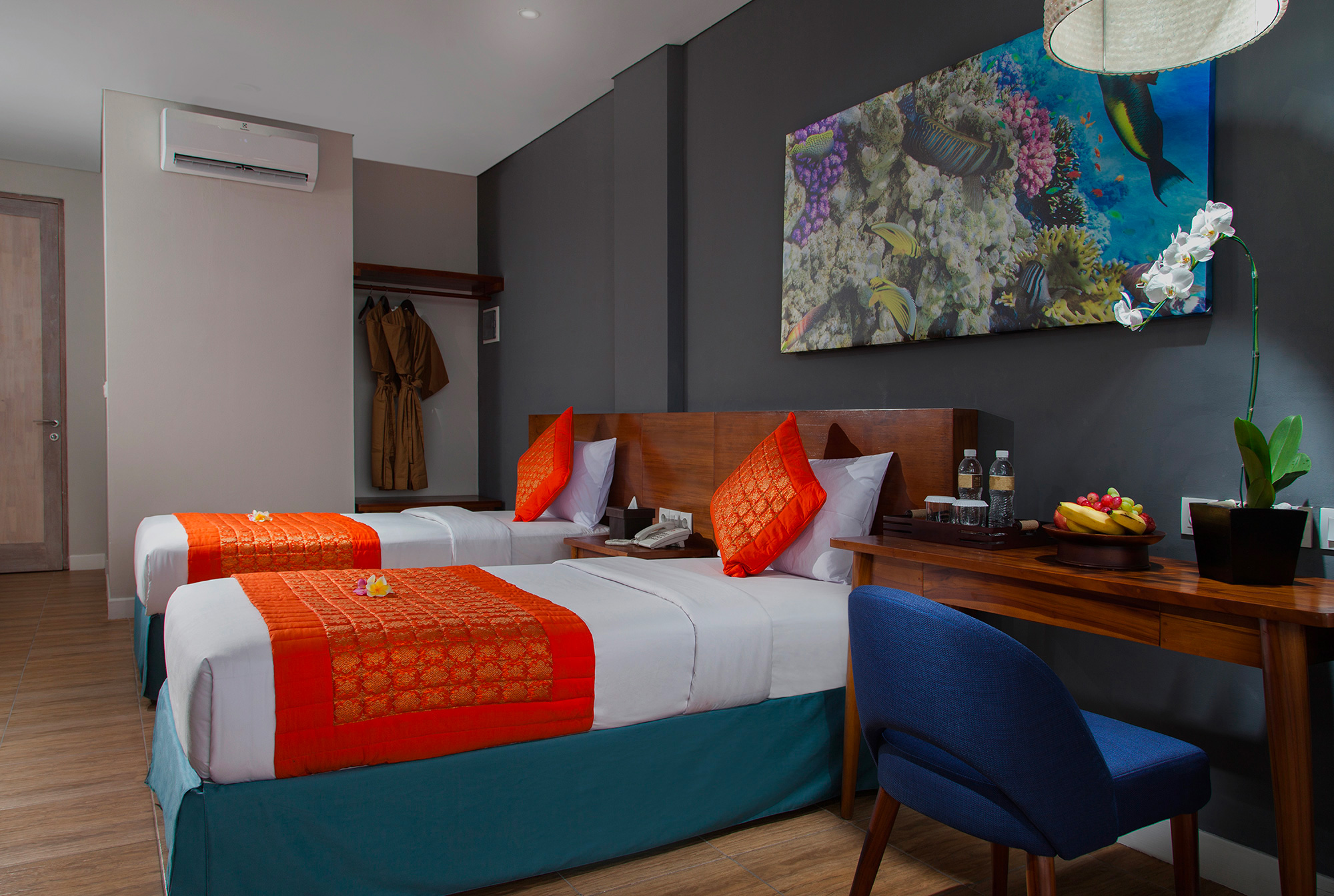 Our beach front, garden and village view rooms all have king beds or are twin share, subject to your request and availability. Every room has a 32 inch LED TV with international and local channels. You will also find tea and coffee available in the room, plus a secure safety deposit box, mini fridge and hair dryer. Every room has air-conditioning and we provide accessories such as soap, shampoo, conditioner, moisturiser, tooth brush, shower cap, vanity kit, comb and slippers.