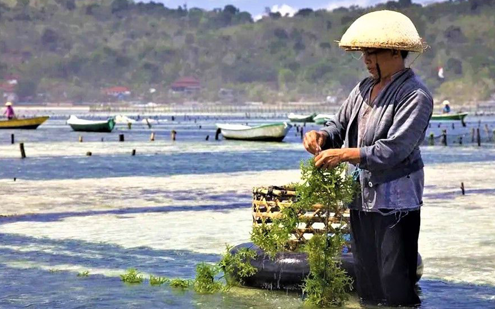 Seaweed farming is an important industry on Nusa Lembongan After it has been cultivated, the seaweed is exported to Japan and China for processing as food additives or in cosmetics. You can observe the whole process of seaweed farming on Nusa Lembongan. It's possible to walk among the seaweed plots at low tide and see local farmers picking them by hand. They're collected in baskets that women place on their heads and carry up to land. Then the seaweed is sorted and dried in the sun.